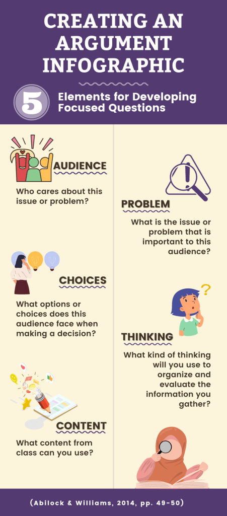 Good argument infographics start with inquiry. Students’ inquiry begins with questions. Students might typically start with the K-W-L strategy to formulate questions (Ogle, 1986) to orient their inquiry. Abilock and Williams (2014) argue that this is not enough. To be relevant, students must consider the infographic’s audience and purpose. Abilock and Williams propose five elements that students’ questions should address. Those are outlined in the infographic to the right.