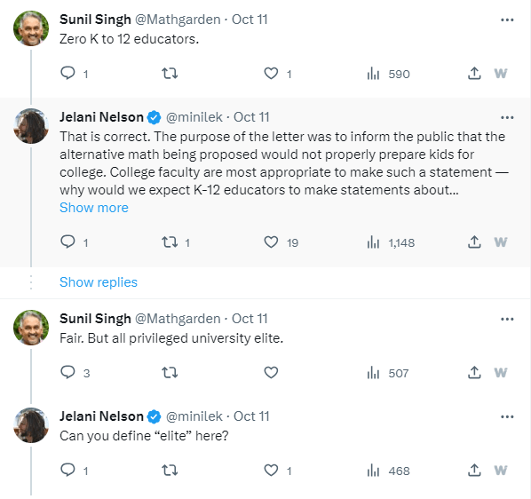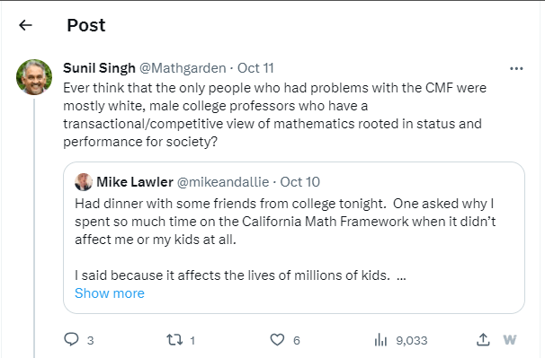 I chose a discussion that occurred on Twitter between Dr. Jelani Nelson, an Engineering and Computer Science professor at UC Berkeley, and Sunil Singh, a former mathematics and physics teacher (see below). Singh starts off the conversation with a claim that seems to criticize a post made by another person, Mike Lawler. Singh’s main claim – actually more of an opinion – is that the only people who take issue with the California Mathematics Framework (CMF) are white, male college professors who view math from a competitive perspective with only the prestigious being able to succeed in the field (Singh, 2023). Singh presents no evidence to support his claim. Lawler is a white, male and also a former math professor.