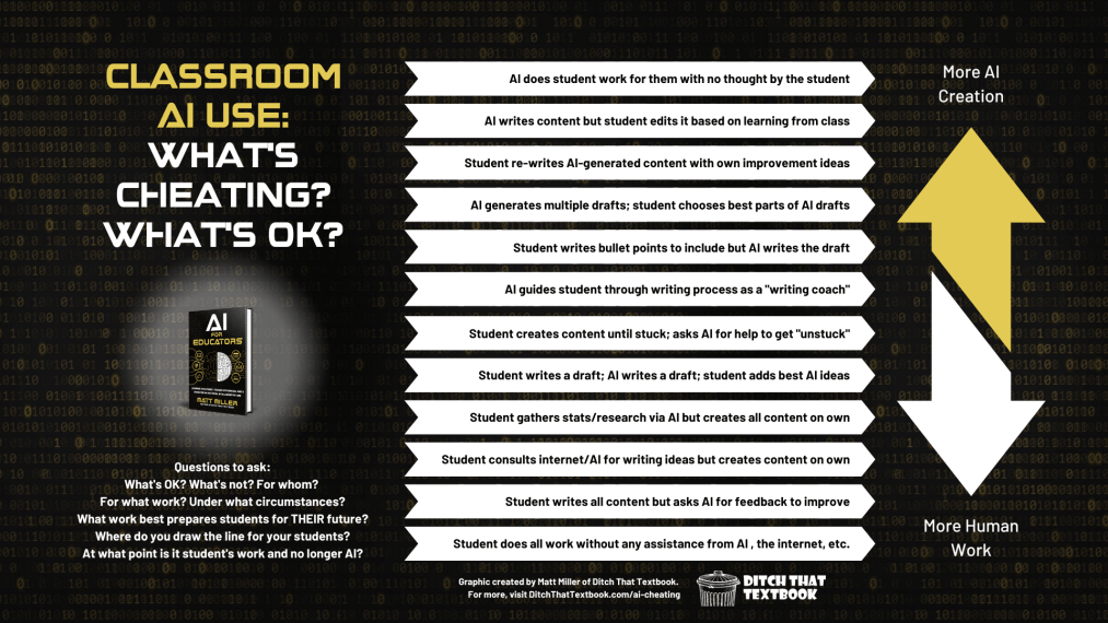 Miller, M. (2023). Classroom AI use: What’s cheating? What’s OK? [Photograph]. Ditch that Textbook. https://ditchthattextbook.com/ai-cheating/