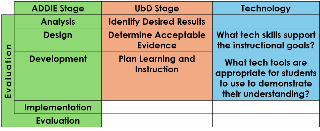 I am always looking for ways to help my teachers be more reflective and intentional with the technology they use with their students. We are currently in the process of reviewing the ISTE Standards for Students to see how they align with the learning targets in our core classes. As we begin to review and align the standards, this mashup model of the ADDIE and UbD Frameworks might be useful in helping teachers think critically about the learning activities they design and how students might be able to demonstrate their understanding through the use of technology. In particular, paying attention to specific tech skills students can use to demonstrate their understanding while also supporting the ISTE Standards for Students.