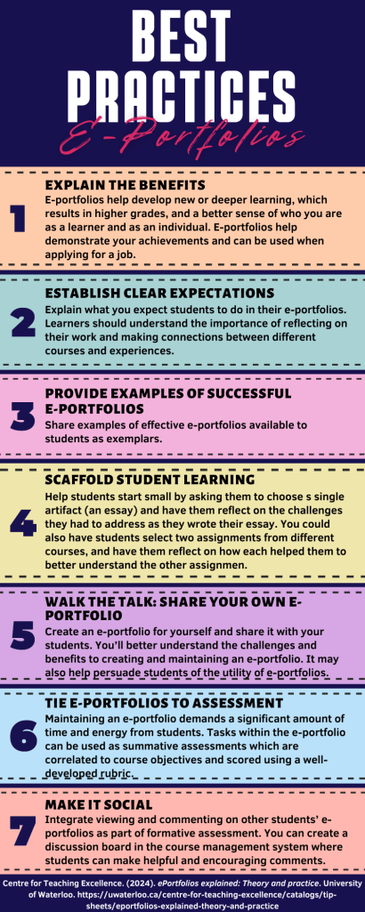 At the right are some best practices for instructors to consider when using e-portfolios with their students (University of Waterloo Centre for Teaching Excellence, 2024). In addition, the University of Waterloo provides an example of one of their student’s e-portfolios.
